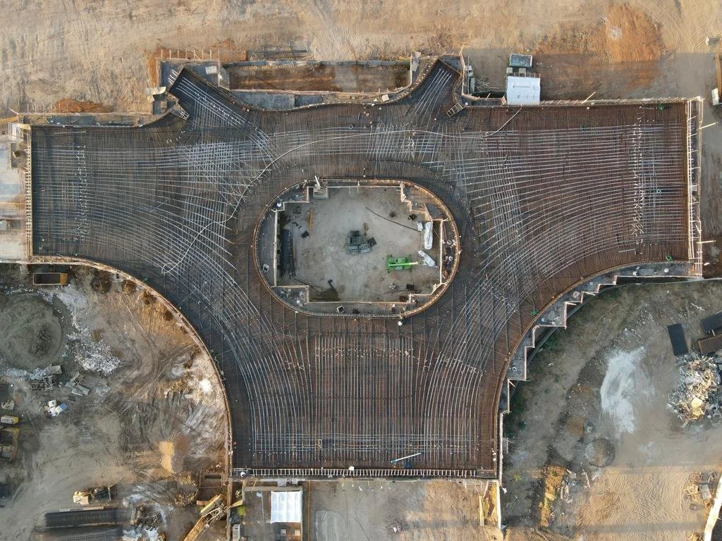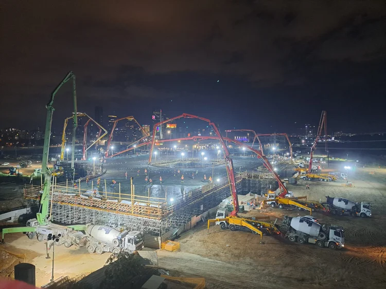 အပေါ်ပိုင်းတည်ဆောက်ပုံ (Superstructure) သည် ၁၂၅ စင်တီမီတာ အထူရှိသော လုပ်ငန်းခွင်အတွင်း လောင်းသွင်းသည့် ကွန်ကရစ်အခင်းပြား (Cast-in-place slab) ဖြင့် ဖွဲ့စည်းထားပြီး စုစုပေါင်း ကွန်ကရစ်ပမာဏ ၁၀,၅၀၀ ကုဗမီတာ ရှိပါသည်။ ၎င်းကို ၅၅၀ တန်ရှိသော ကွန်ကရစ်အကြိုအားဖြည့်ကြိုးများ (Post-tensioning cables) ဖြင့် အားဖြည့်ထားပါသည်။ အပေါ်ပိုင်းတည်ဆောက်ပုံ၏ ကြီးမားသော ထုထည်ပမာဏကြောင့် တံတား၏ အလယ်ဗဟိုမှ အပြင်ဘက်သို့ အဆင့် ၅ ဆင့်ခွဲ၍ အသေးစိတ် ကွန်ကရစ်လောင်းခြင်း လုပ်ငန်းစဉ်ကို ဆောင်ရွက်ခဲ့ပါသည်။ ပထမအဆင့်ကို အလယ်ဗဟိုရင်ပြင်မှ စတင်ခဲ့ပြီး နောက်ပိုင်းတွင် တံတား၏ လက်တံများသို့ ဆက်လက်လုပ်ဆောင်ခဲ့ပါသည်။ ကွန်ကရစ် ၅,၅၀၀ ကုဗမီတာ လောင်းသွင်းသည့် အဆင့်တွင် ကွန်ကရစ်ပန့် (Concrete pump) ၉ လုံးကို တစ်ပြိုင်နက်တည်း အသုံးပြုခဲ့ပါသည်။