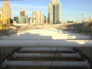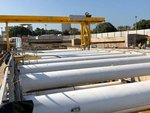 တည်ဆောက်ရေးလုပ်ငန်းစဉ်အတွင်း အပြင်ဘက်အဆောက်အအုံ (Outer box) ၏ နံရံများကို ထောက်ကန်ပေးနိုင်ရန် ယာယီ အတွင်းပိုင်းထောက်တိုင်များ (Inner struts) နှင့် Waling beams များကို အသုံးပြုထားရာ ၎င်းတို့အတွက် အသေးစိတ်ပုံစံထုတ်ခြင်းနှင့် တည်ဆောက်ရေးအစီအစဥ် (Construction sequence) တို့ကို အထူးဂရုပြု ညှိနှိုင်းဆောင်ရွက်ခဲ့ရပါသည်။ မြေအောက်ရေမျက်နှာပြင် မြင့်မားမှုကြောင့် အဆောက်အအုံ၏ အောက်ခြေတွင် ကြီးမားသော ရေဖိအားကြောင့် ပေါ်ထွက်လာသည့် ပင့်တင်အားများ (Buoyancy forces) ဖြစ်ပေါ်စေပါသည်။ ထို့ကြောင့် ဘူတာရုံ၏ အောက်ခြေတွင် သံကူကွန်ကရစ် ‘Plug-slab’ တစ်ခုကို ထည့်သွင်းထားပြီး ၎င်းကို တင်းအားခံဘိုအင်တိုင်များ (Tension piles) ဖြင့် ထိန်းချုပ်ထားပါသည်။